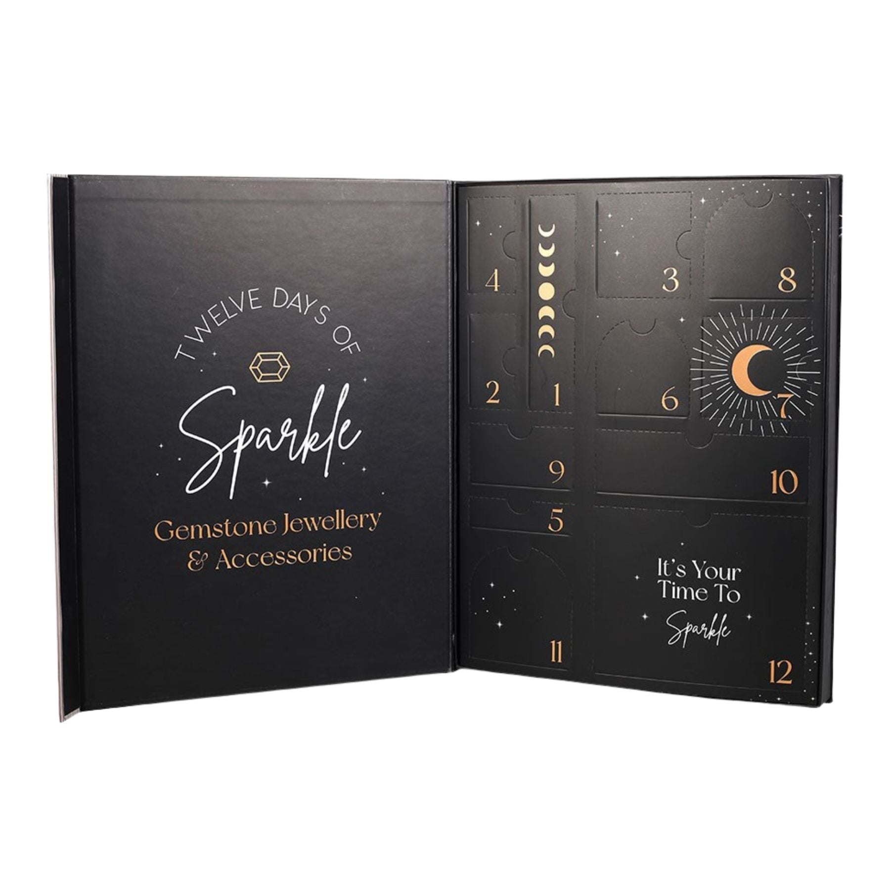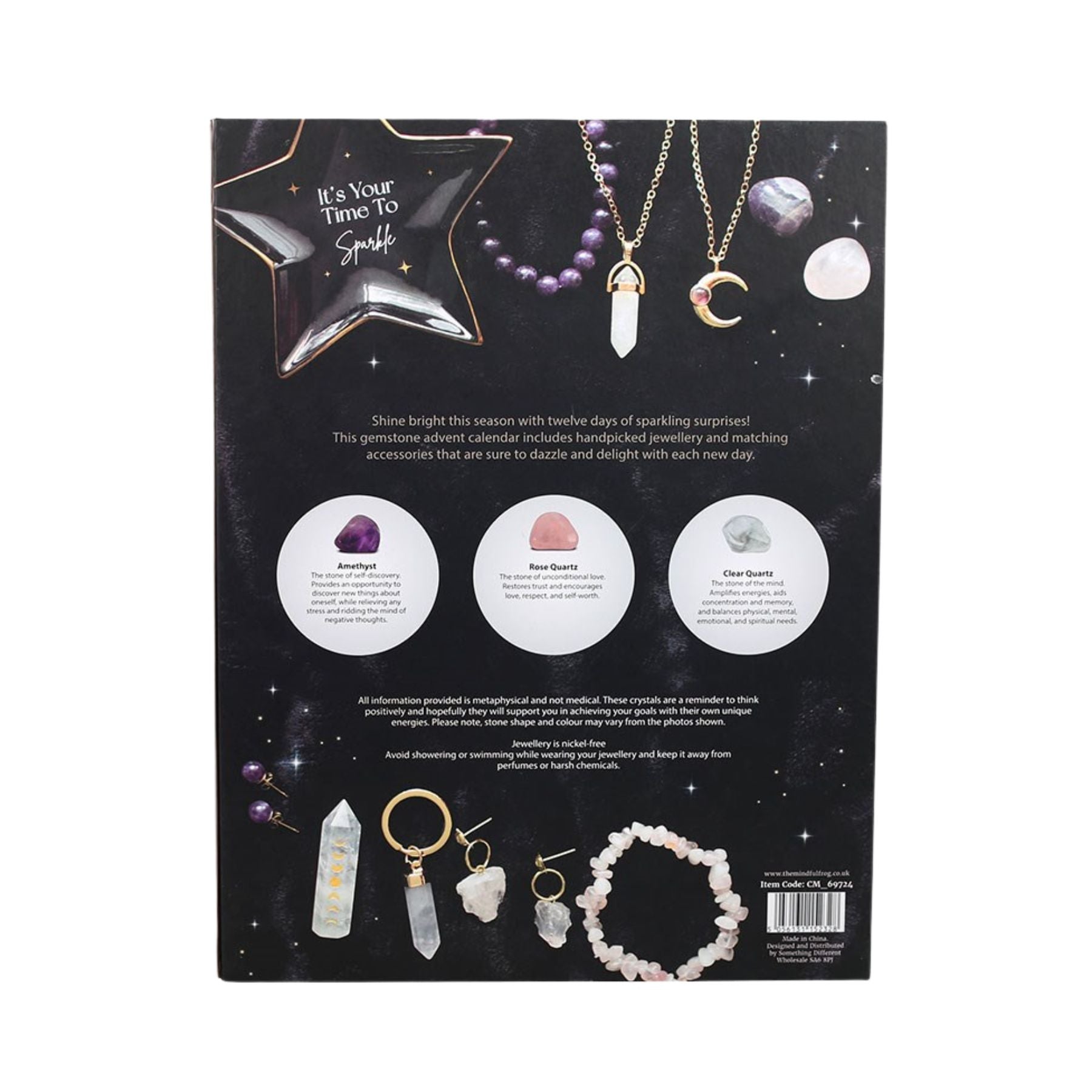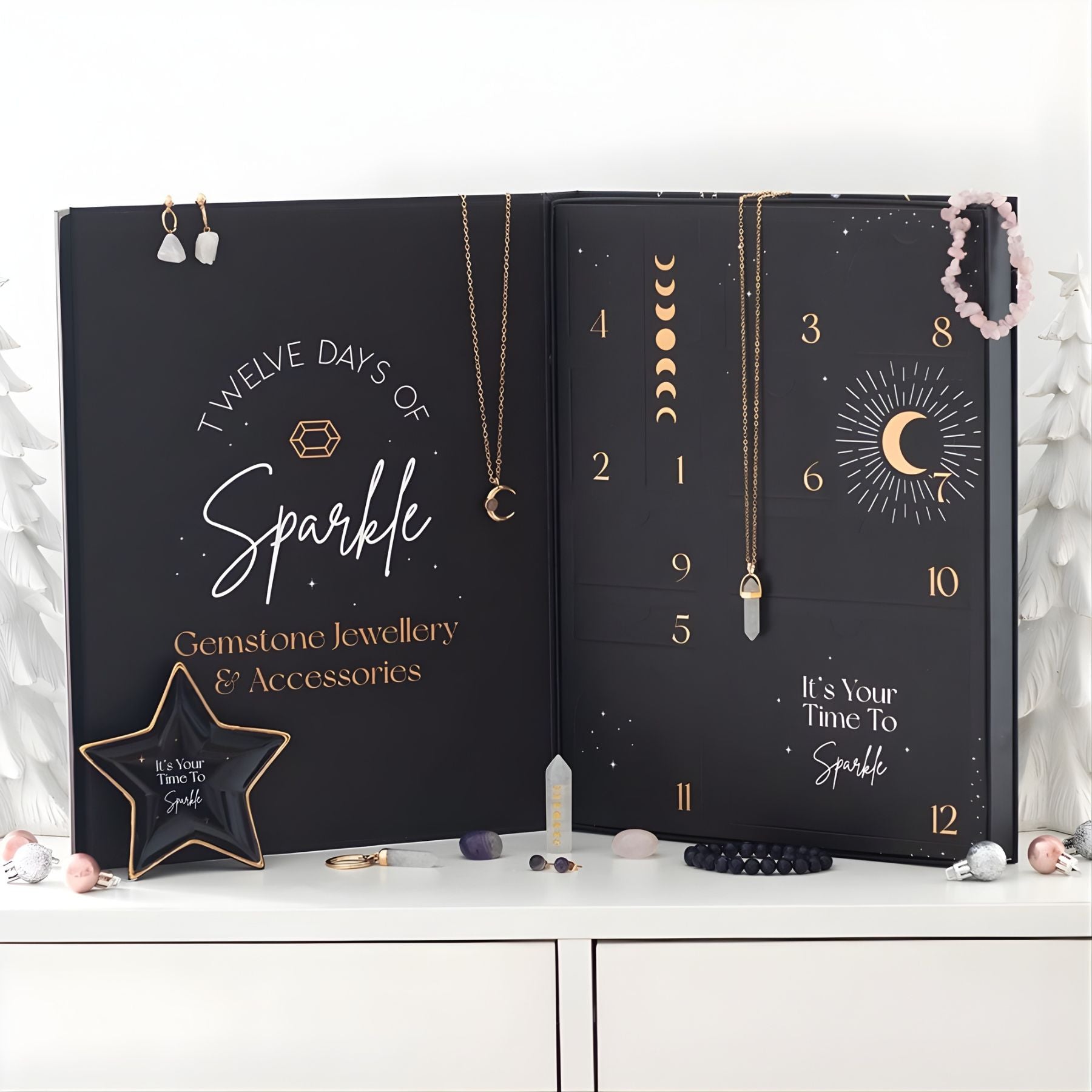 Make the season shine with the 12 Days of Jewelry Advent Calendar, a magical collection of handpicked crystal jewelry and matching accessories. Behind each door waits a thoughtful surprise, including earrings, necklaces, bracelets, a keyring, loose gemstones, a crystal point, and even a charming trinket dish. Each piece is beautifully curated to bring a touch of sparkle and intention to your holiday countdown.