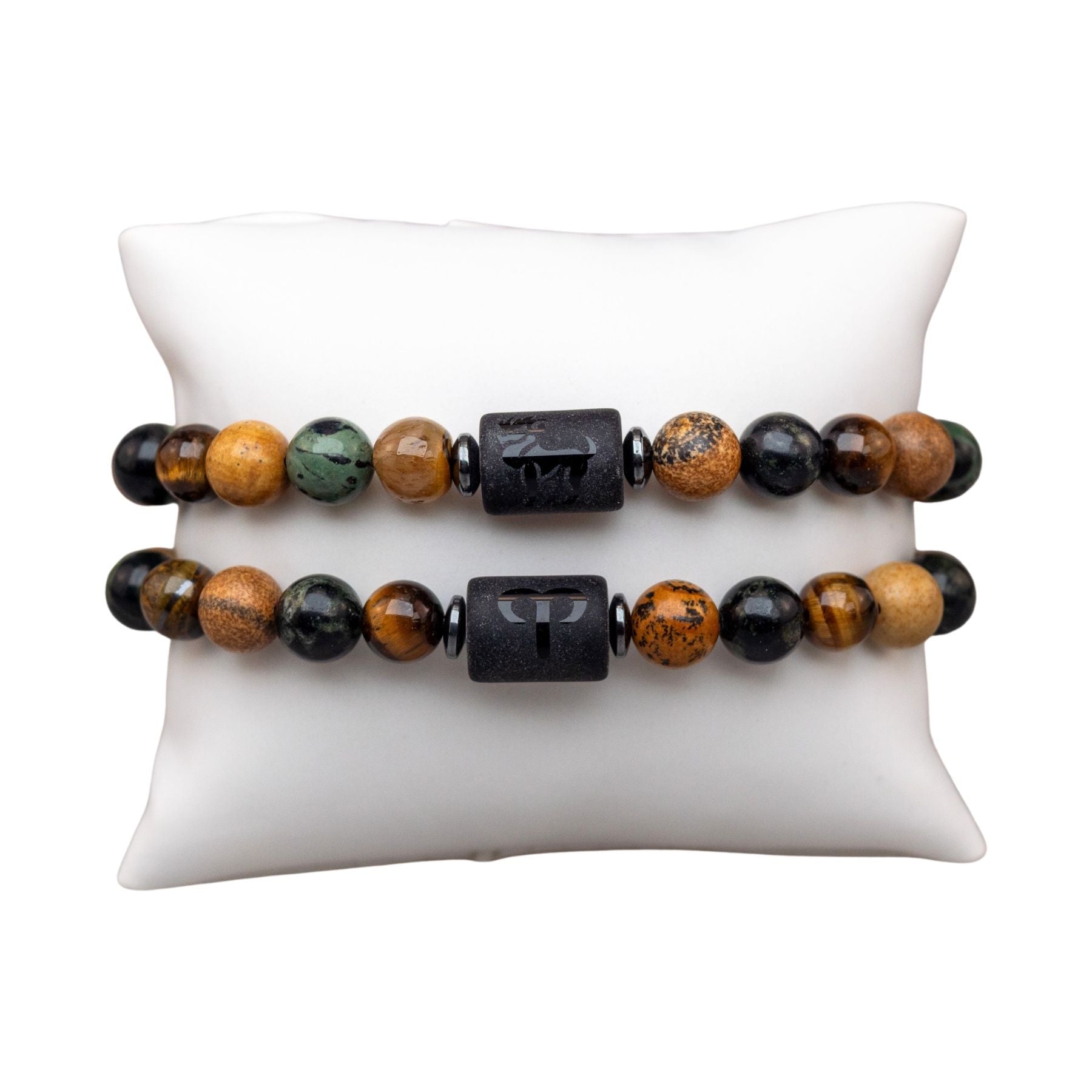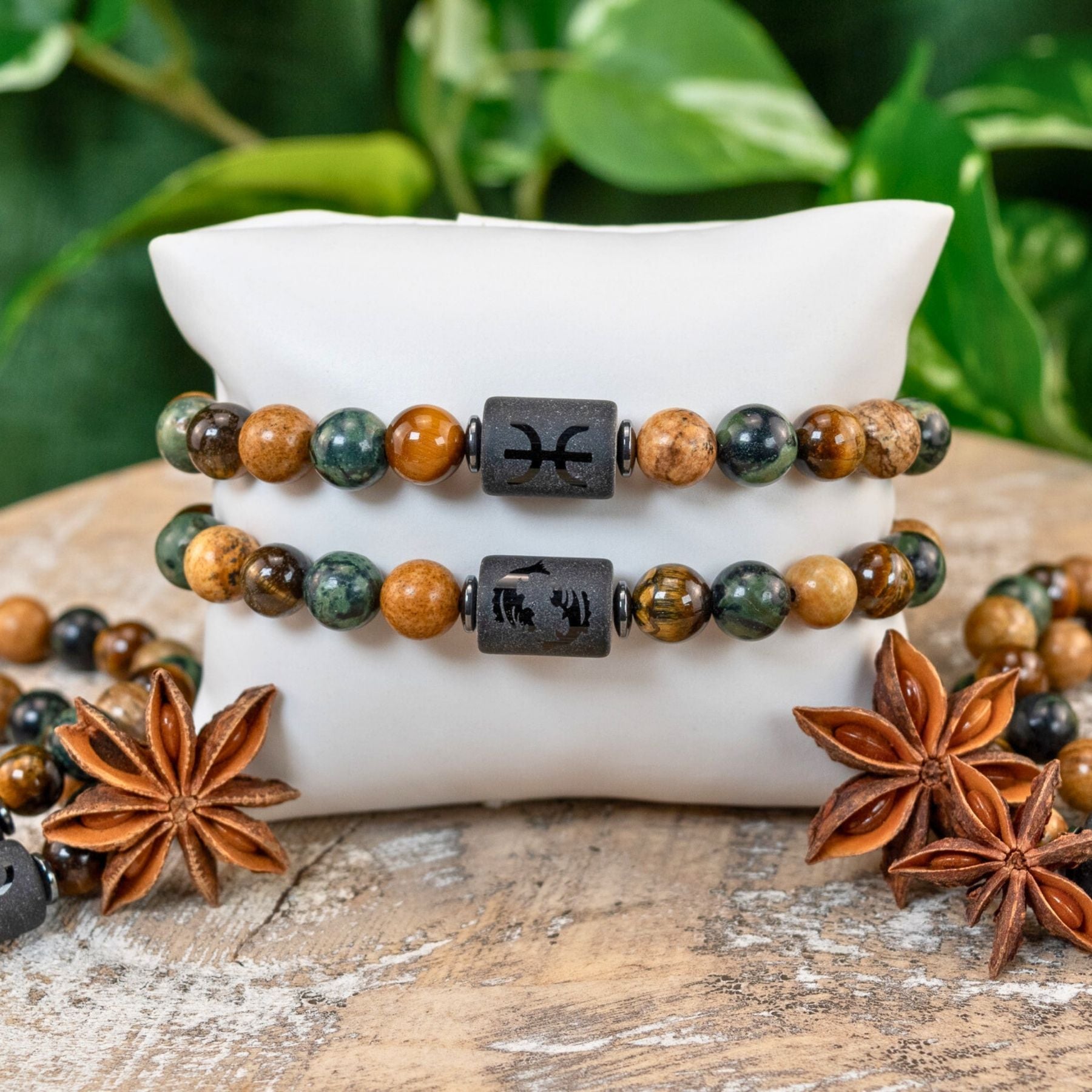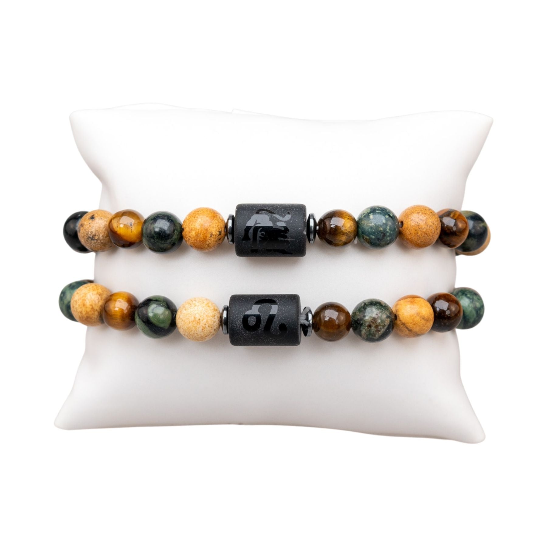 Each piece features your zodiac symbol alongside its corresponding spirit animal, engraved on a sleek centerpiece bead. Thoughtfully designed with a curated mix of 8mm natural stone beads, these bracelets blend meaning, personality, and earthy elegance into one wearable statement.