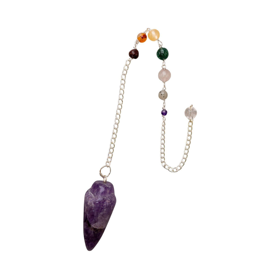 Enhance your spiritual practice with the Amethyst Curved Pendulum featuring seven chakra stones along its chain. This beautifully balanced pendulum combines the calming energy of amethyst with the harmonious vibrations of each chakra stone, creating a powerful tool for divination, chakra alignment, and energy healing.