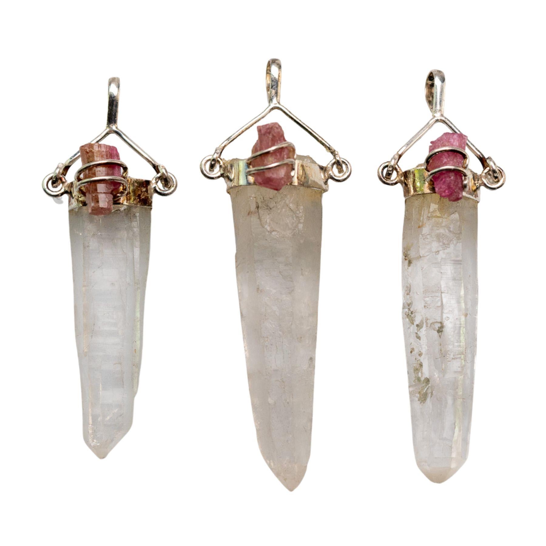Measuring approximately 2.25 inches long, these pendants are the perfect size for everyday wear or layering with your favorite pieces. Clear quartz is often associated with clarity, amplification, and energy cleansing, while Rubalite is loved for its connection to the heart and emotional warmth, making this pendant both meaningful and visually striking.