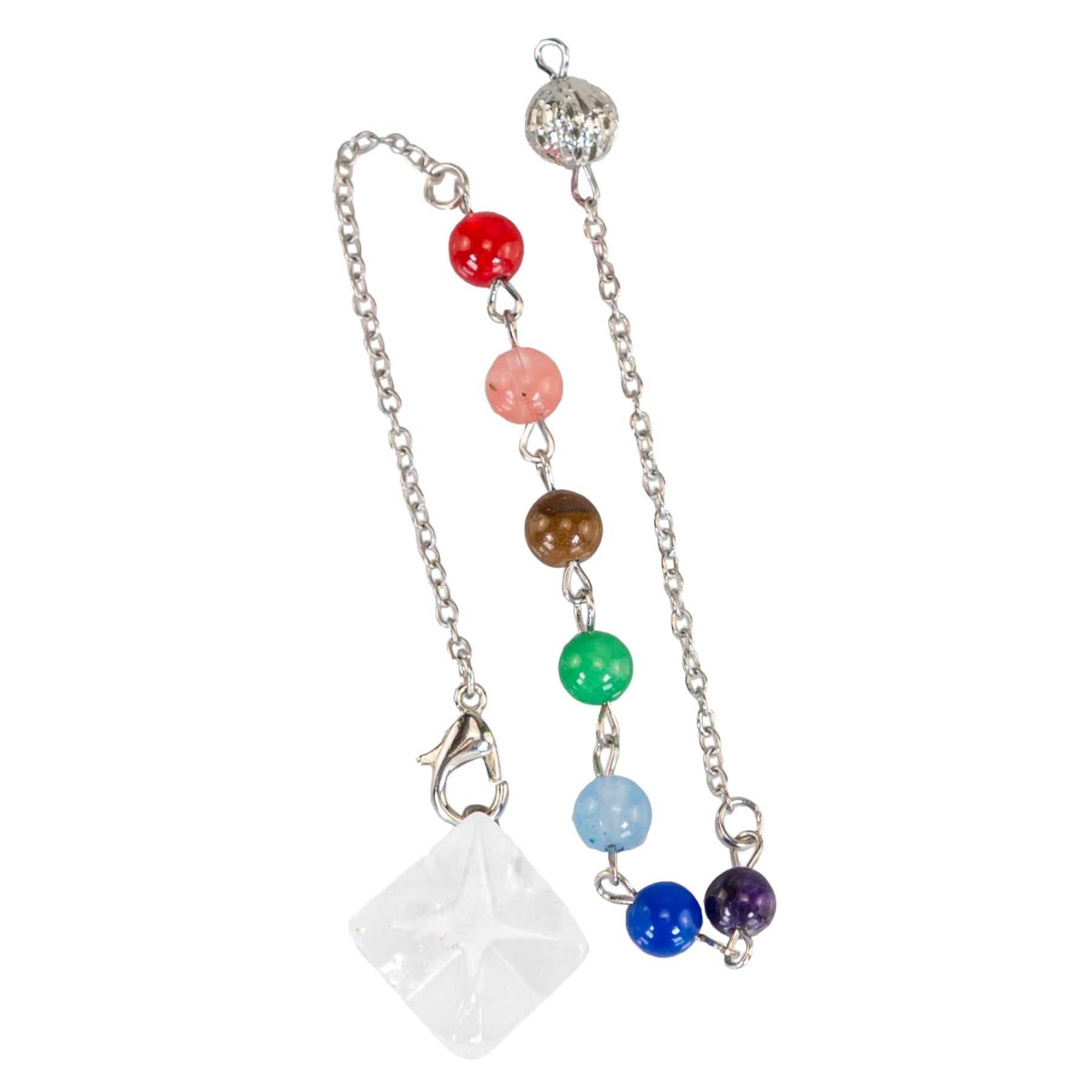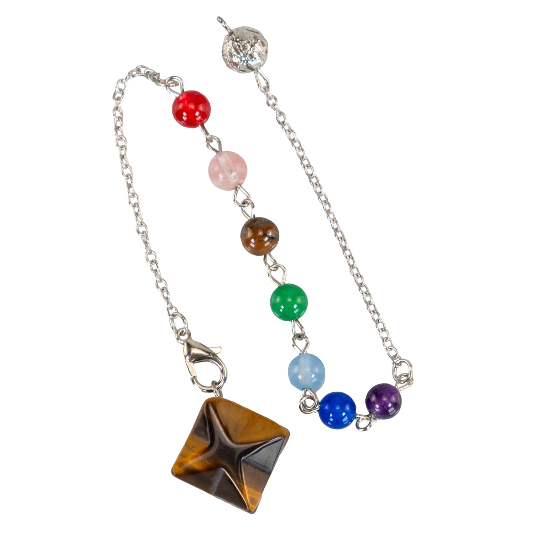 This Merkaba Pendulum with Chakra Stones on the Chain combines refined craftsmanship with purposeful design, making it both a functional divination tool and an elegant spiritual accessory. The pendulum features a Merkaba-shaped stone, symbolizing balance and harmony, suspended from a chain accented with carefully selected chakra stones representing the seven energy centers. Each stone is chosen to support energetic alignment and promote a sense of balance and clarity. Designed for both aesthetic appeal and intentional use.