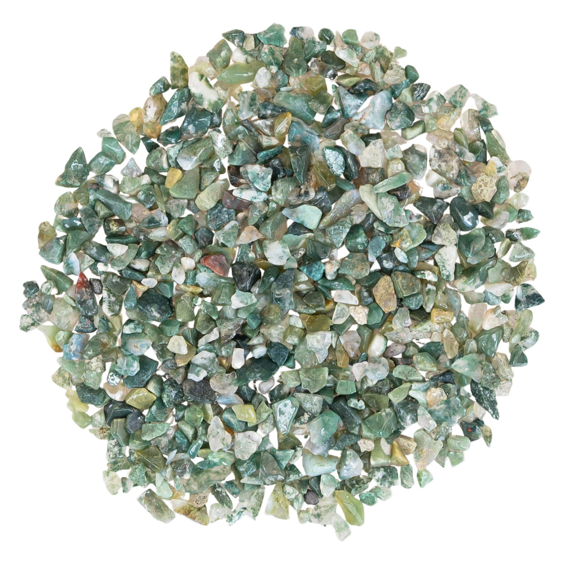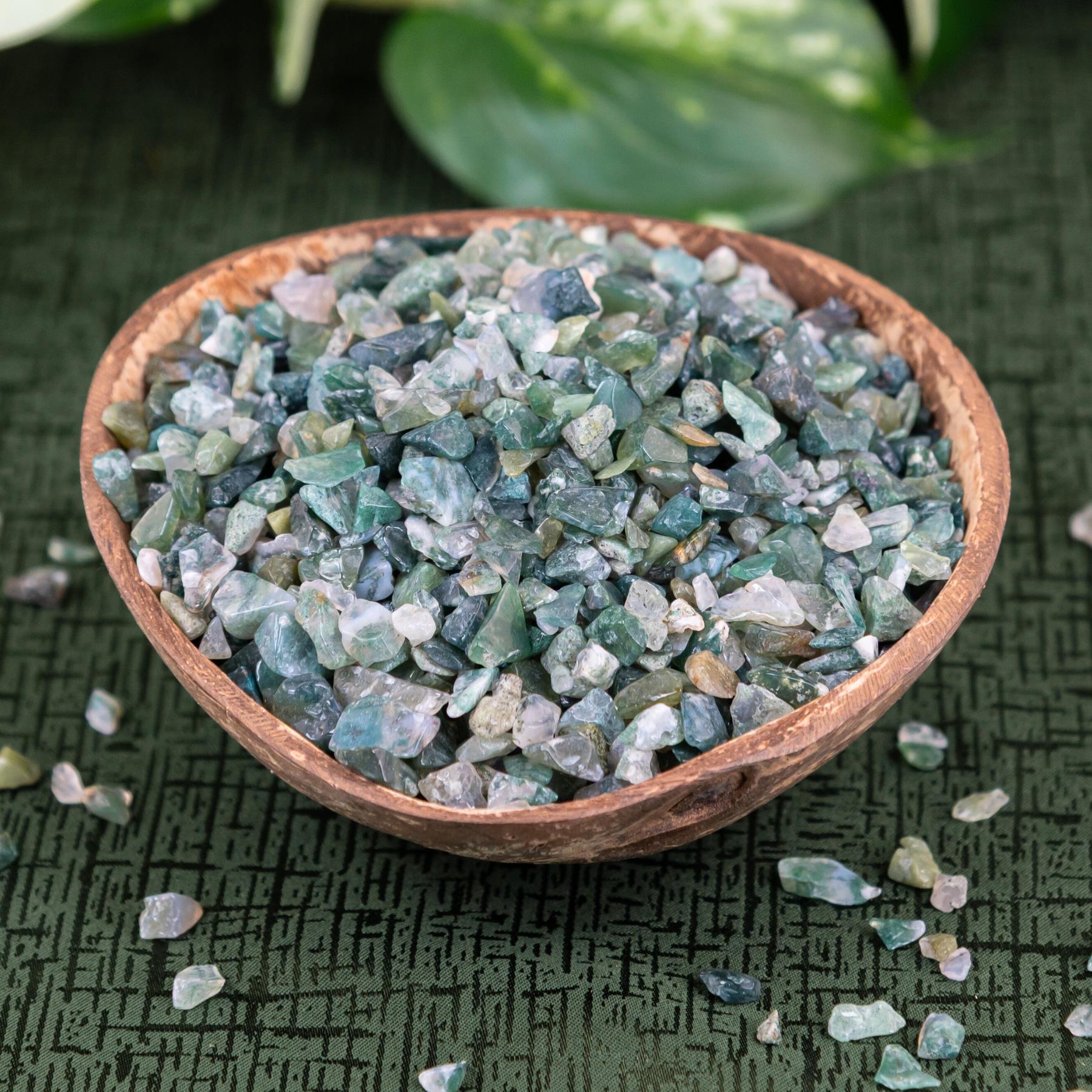 Green Moss Agate crystal chips feature earthy green tones with natural white and translucent inclusions that resemble moss or forest growth. Known as a stone of abundance and renewal, Green Moss Agate is associated with growth, stability, and connection to nature. These chips are ideal for crystal grids, spell jars, resin art, jewelry making, planters, terrariums, and meditation or altar décor. Their grounding energy makes them popular for attracting prosperity, encouraging emotional balance, and supporting new beginnings.