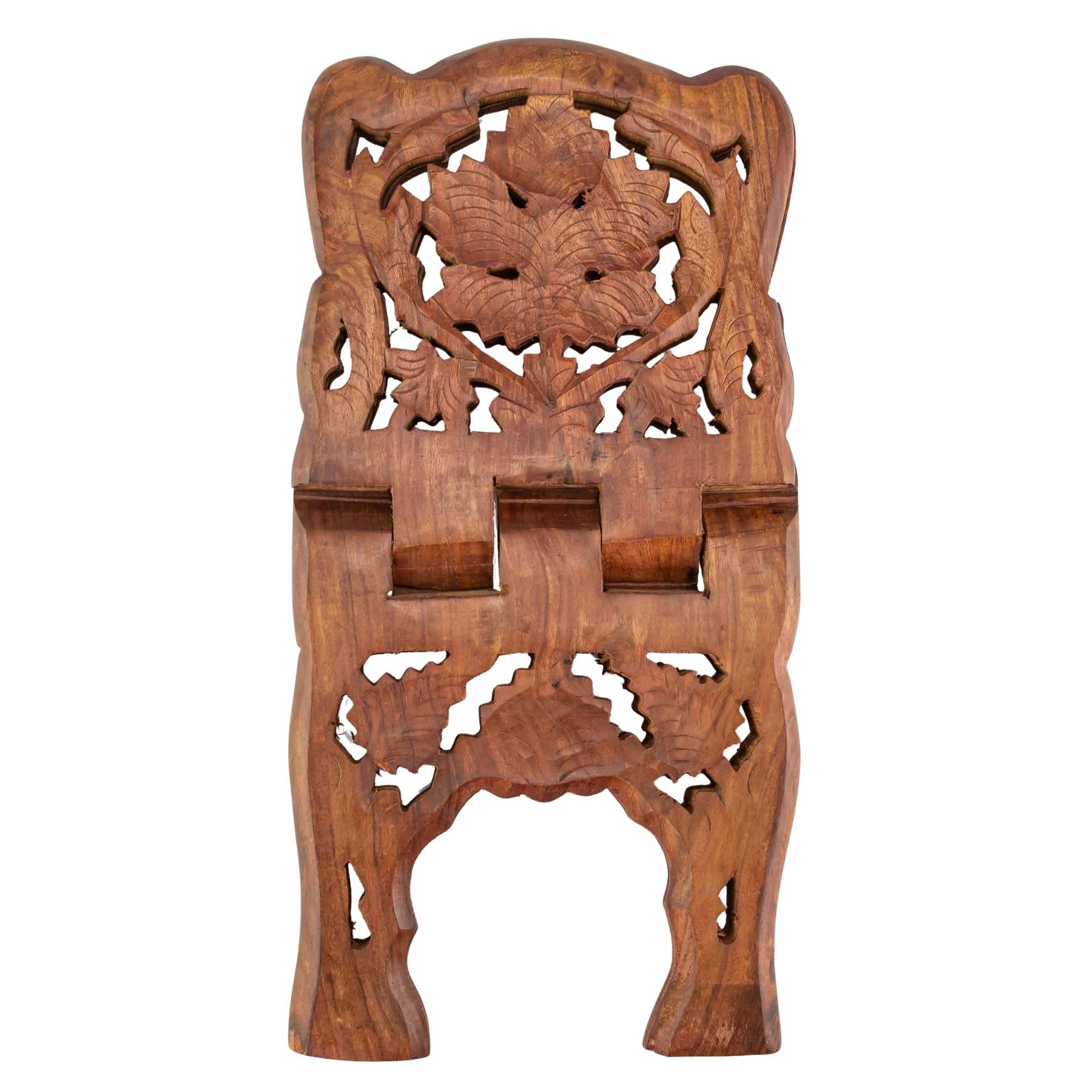 Add both function and artistry to your reading space with this Hand Carved Wooden Book Holder. Inspired by the traditional X-shaped rihal design, this 11-inch stand features intricate floral and foliage jali cut-work that highlights skilled craftsmanship. Designed for ergonomic, hands-free use, it keeps books elevated for more comfortable reading while helping reduce neck and hand strain during extended sessions. The sturdy wooden construction provides reliable support, while the collapsible design allows it to fold flat for easy storage or travel. When opened, it measures 13” in length, 7.6” in width, and 7.3” in height, making it ideal for use with a variety of books. A practical and decorative piece, perfect for study, display, or everyday reading.