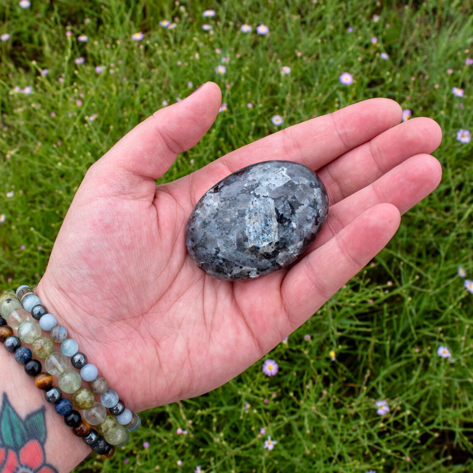 Grounding yet subtly mystical, Larvikite is a stone of inner strength and psychic clarity. Use this palm stone to dispel negative energy, sharpen your mind, and open to higher guidance, all while staying rooted and focused.