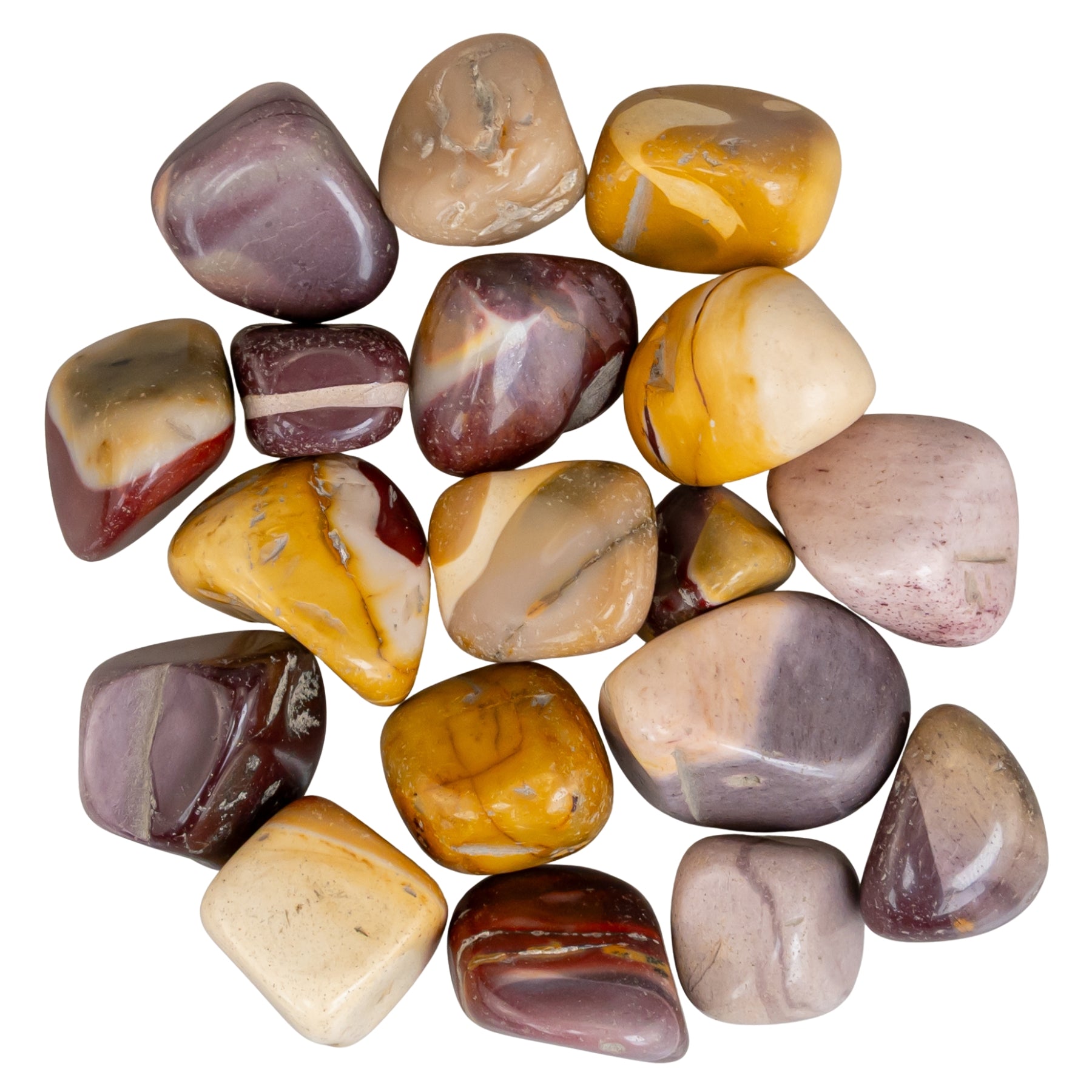 Approximately .5"-1" sized polished Mookaite pieces.