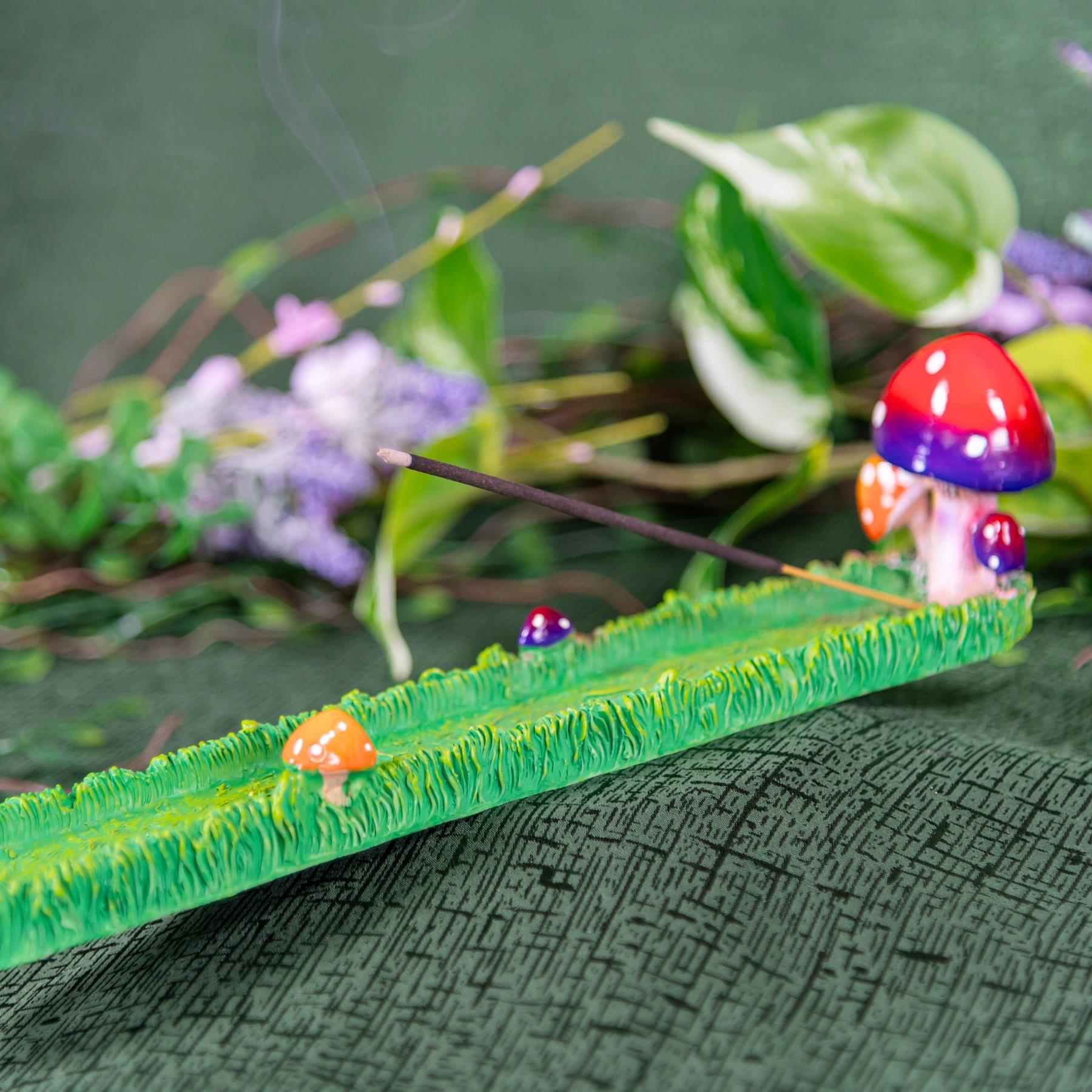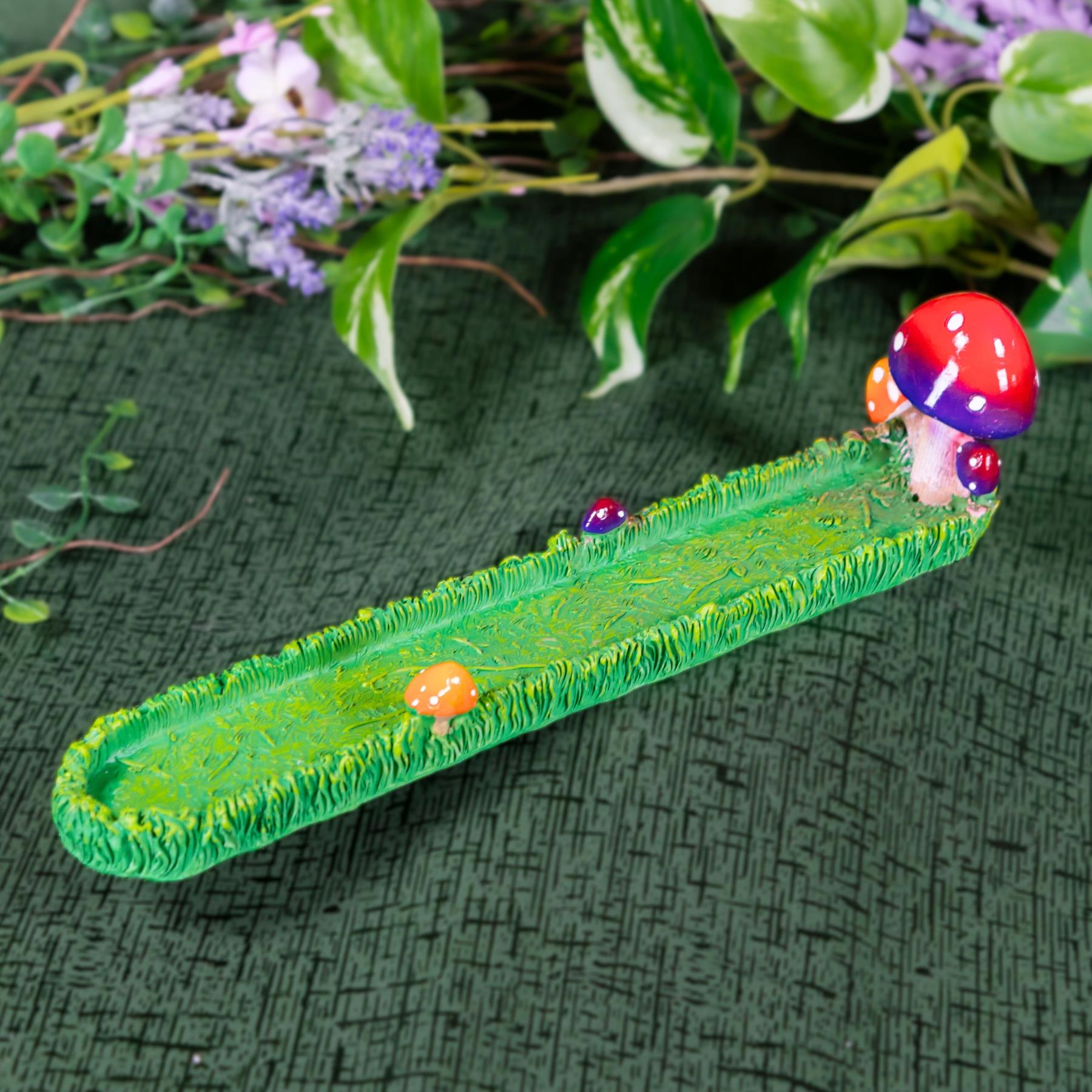 Add a touch of woodland magic to your space with this whimsical Mushroom Incense Burner. Measuring 11 inches long, it features a hand-painted grassy pathway design accented with colorful mushrooms and a large mushroom at the end, creating a charming fairy-garden aesthetic. Designed to hold standard incense sticks, the tray gently disperses smoke for a calming visual effect while keeping ash contained.