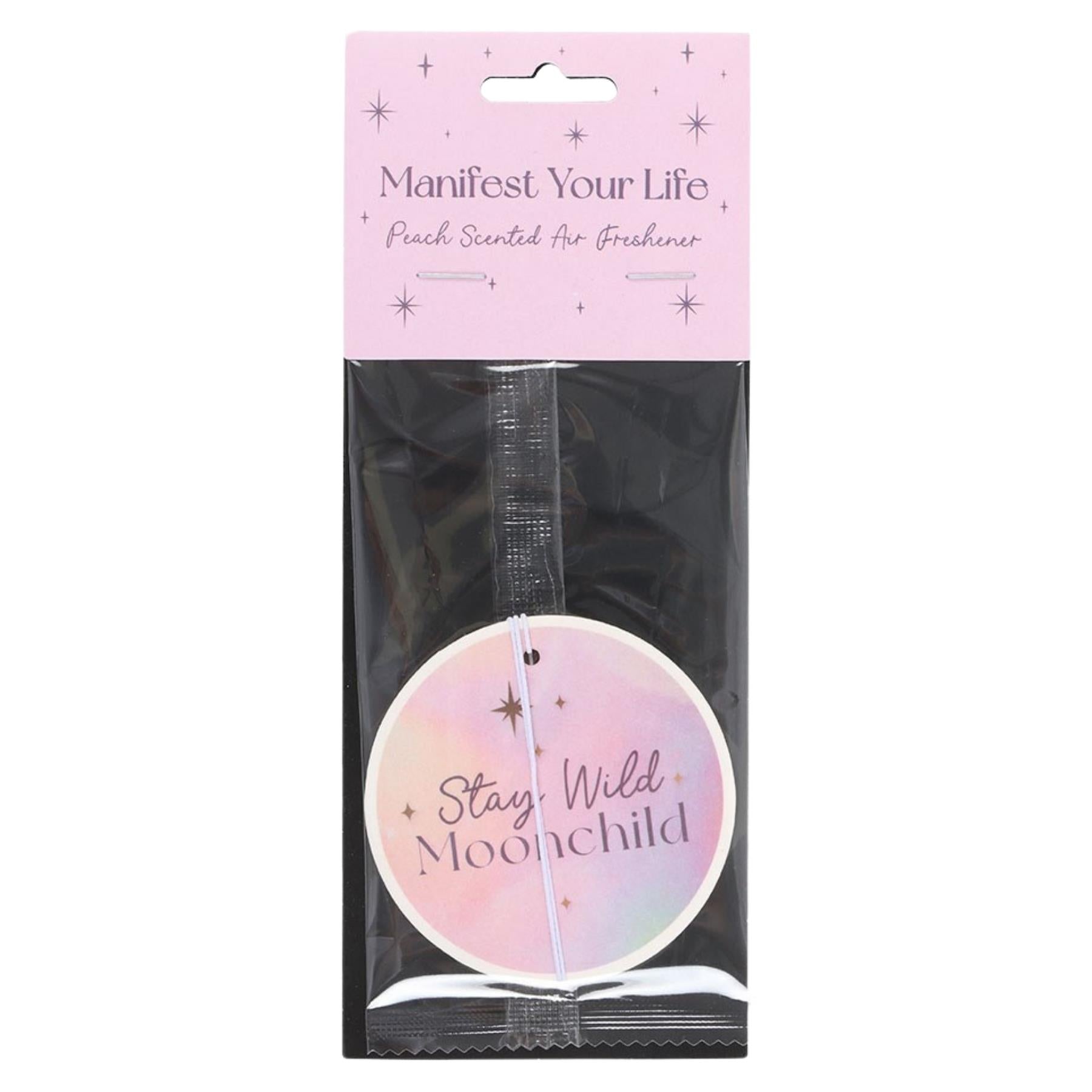 Add a touch of celestial charm to your space with this Peach Stay Wild Moonchild Air Freshener. Featuring a soft pastel gradient design with delicate star accents and the uplifting phrase “Stay Wild Moonchild,” this hanging air freshener blends inspiration with a sweet, juicy peach fragrance. Perfect for cars, lockers, closets, or small rooms, it delivers a light, refreshing scent while bringing a dreamy, free-spirited vibe wherever it’s displayed. Easy to hang and beautifully packaged, it makes a thoughtful gift or a charming everyday accessory for anyone who loves a little magic in their routine.