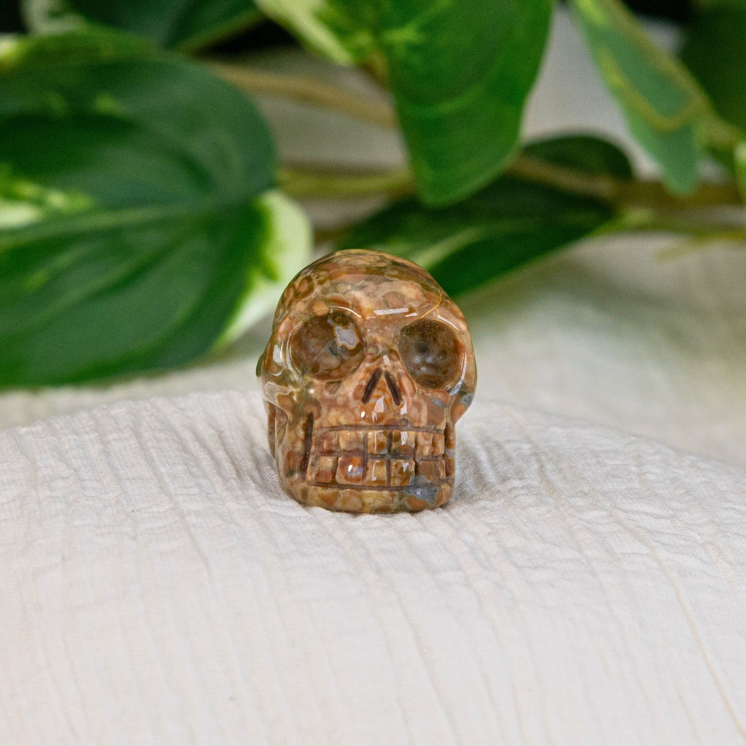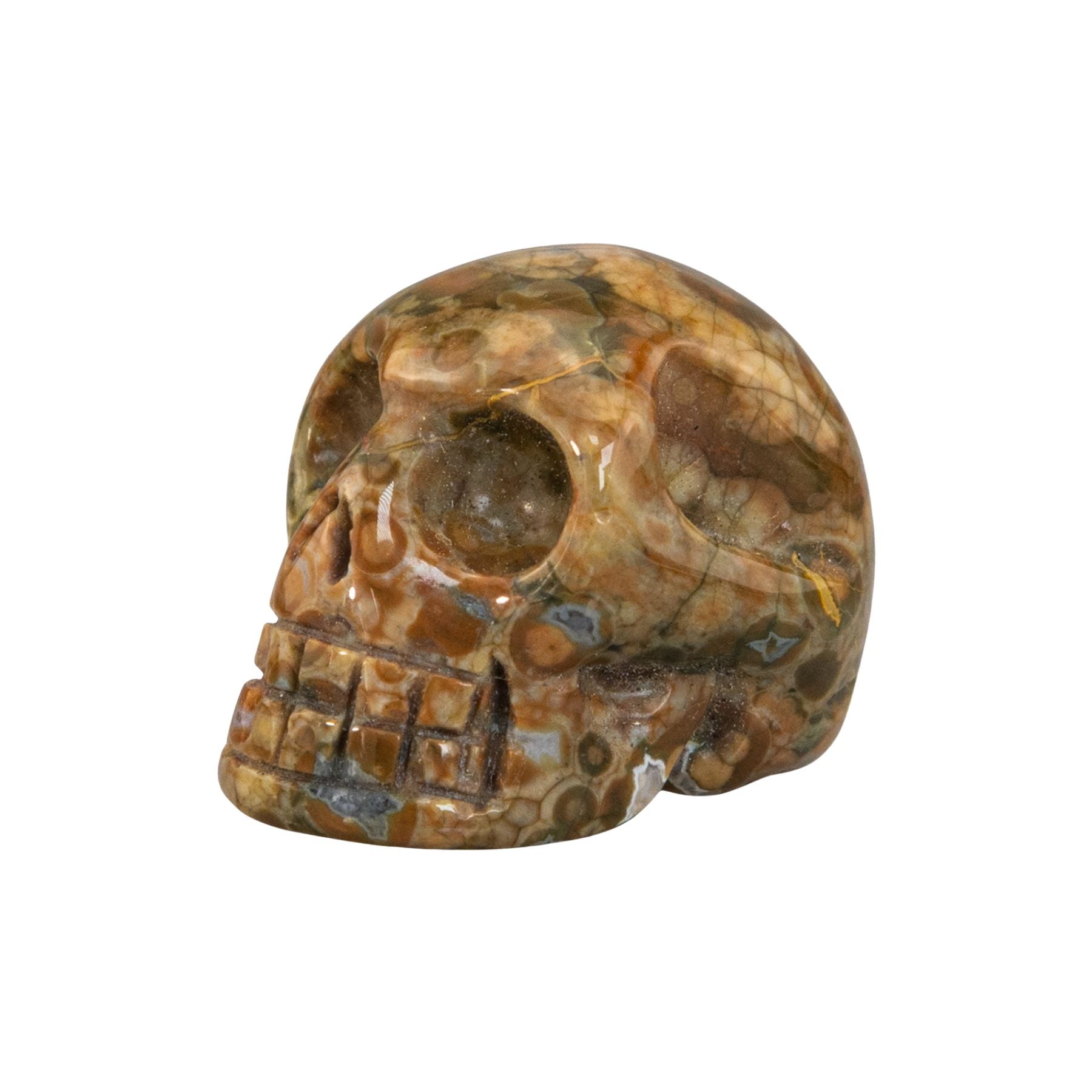 Each intricately carved detail showcases the mesmerizing colors and patterns of Rhyolite, from its earthy greens and browns to its intriguing speckles and swirls. This natural gemstone is believed to possess grounding and balancing properties, making it not only a visually stunning piece but also a source of potential energy and serenity.