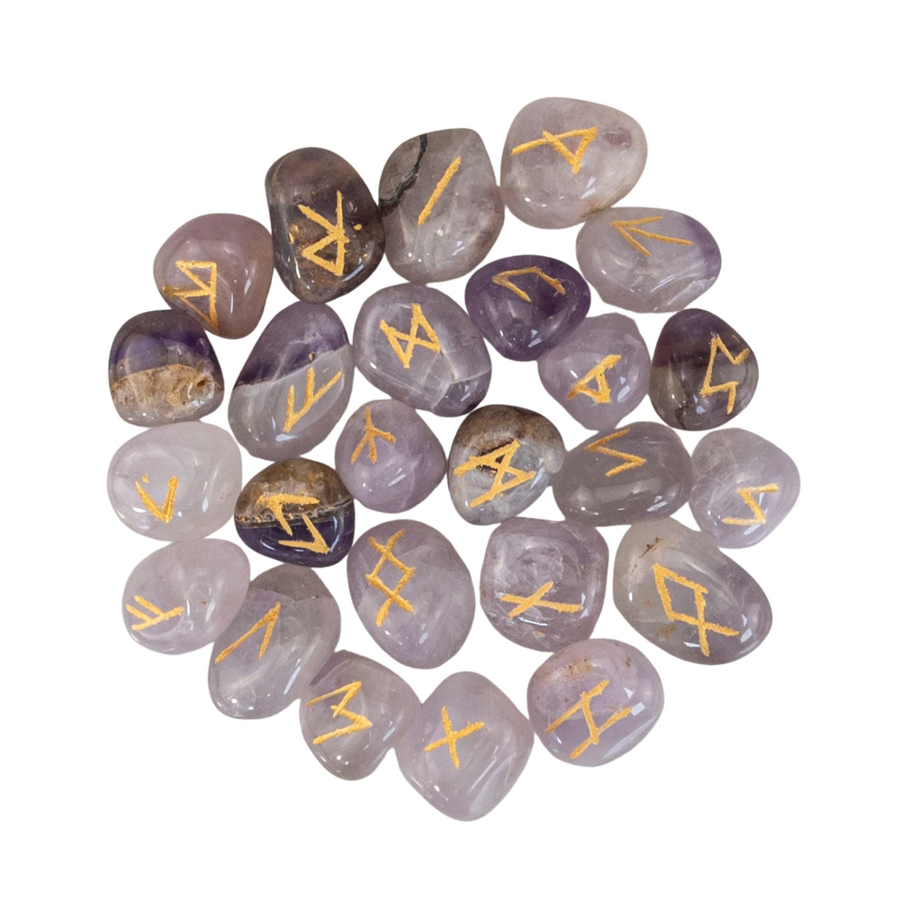 This set of 25 amethyst runes blends the timeless art of divination with the natural energy of crystals. Each rune is hand-carved into polished amethyst, a stone known for its spiritual protection, clarity, and calming energy. The deep purple surface highlights the etched symbols, making them both visually striking and practical for meditation, guidance, or ritual work. Amethyst enhances intuition, allowing for deeper insight during readings. The full set comes in a purple bag for safekeeping and easy transport, making it both a meaningful tool and a beautiful keepsake.