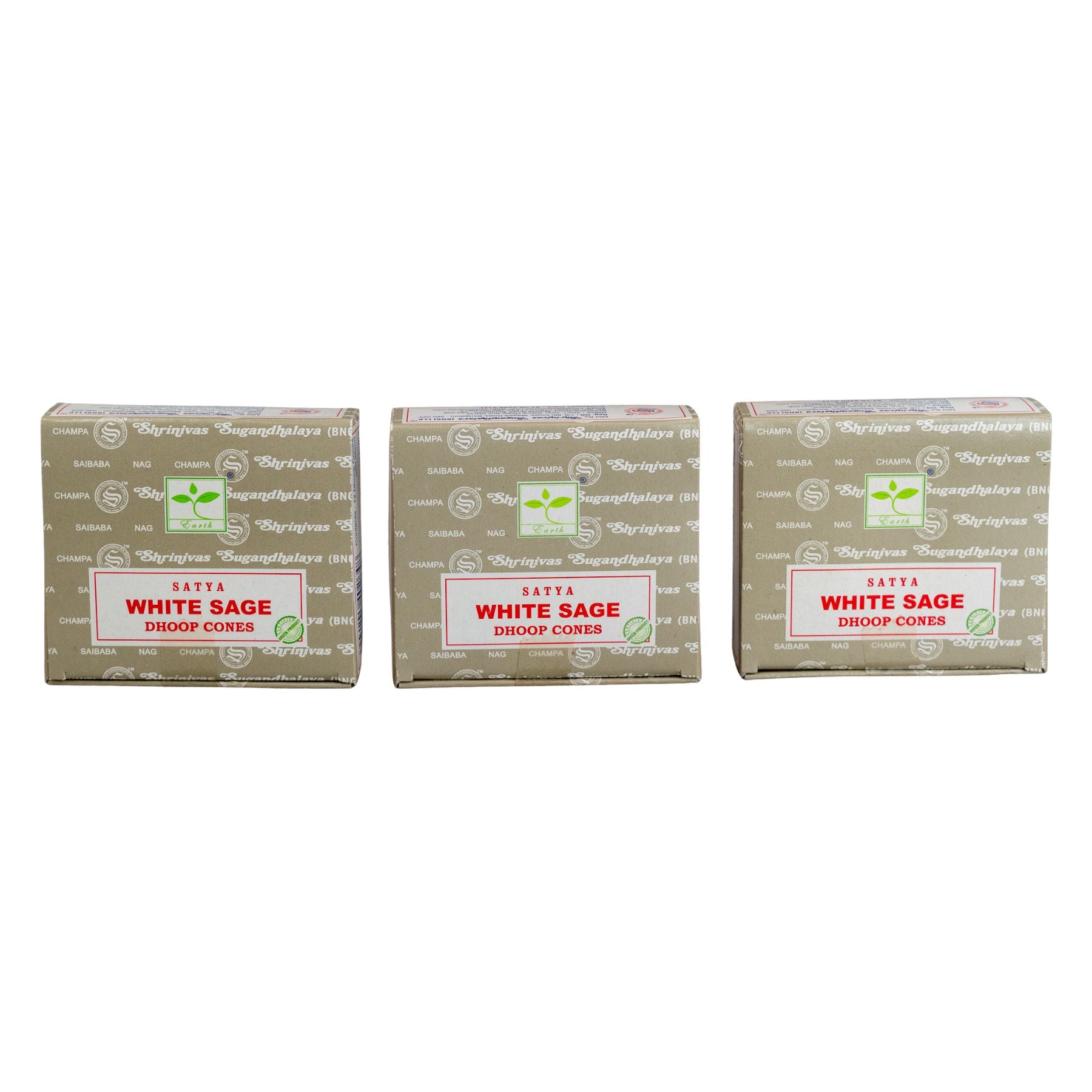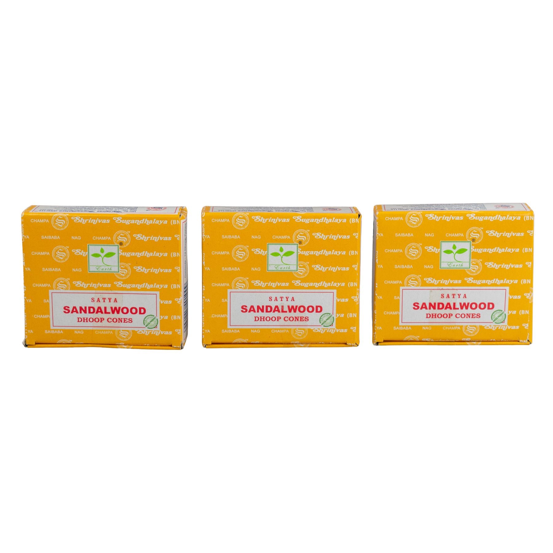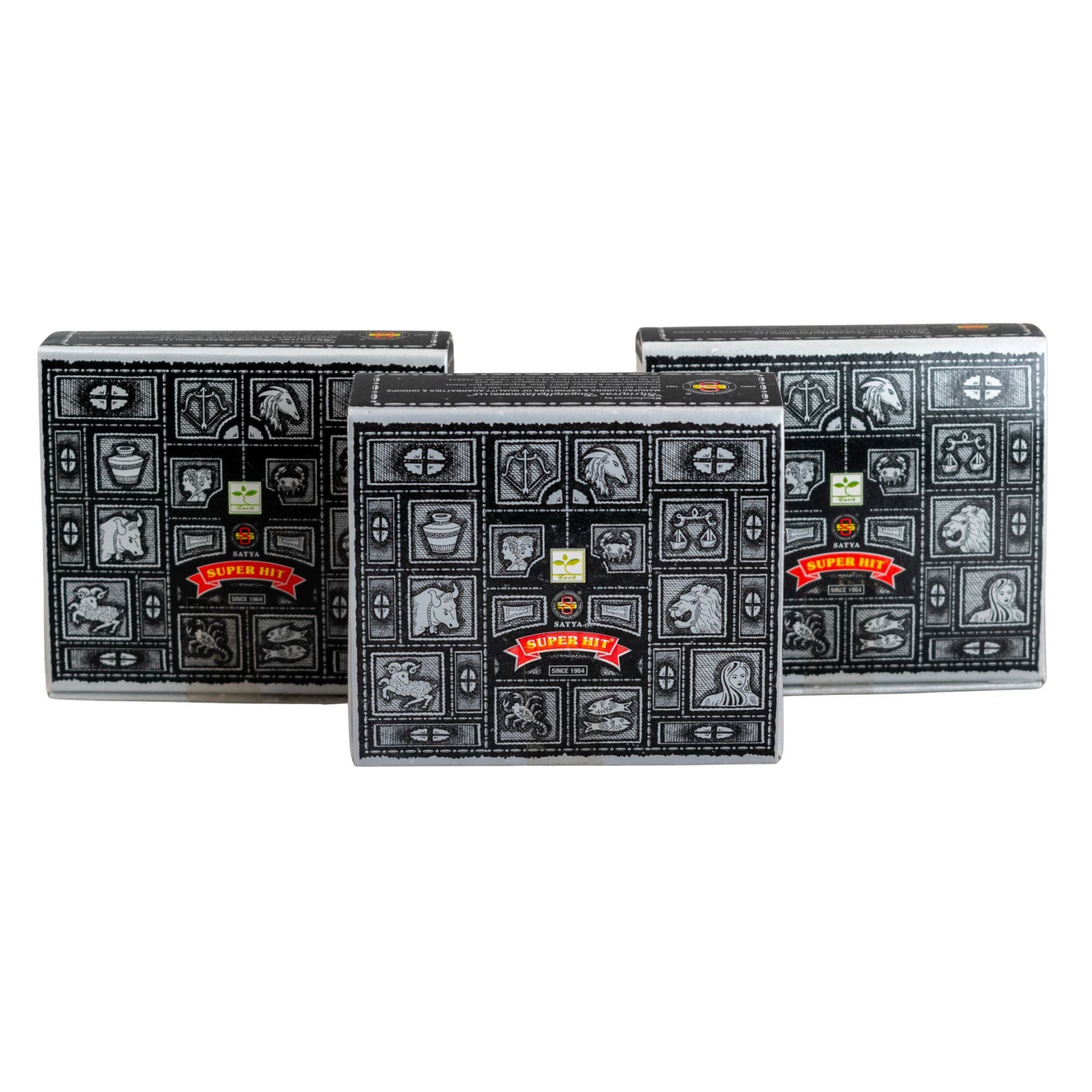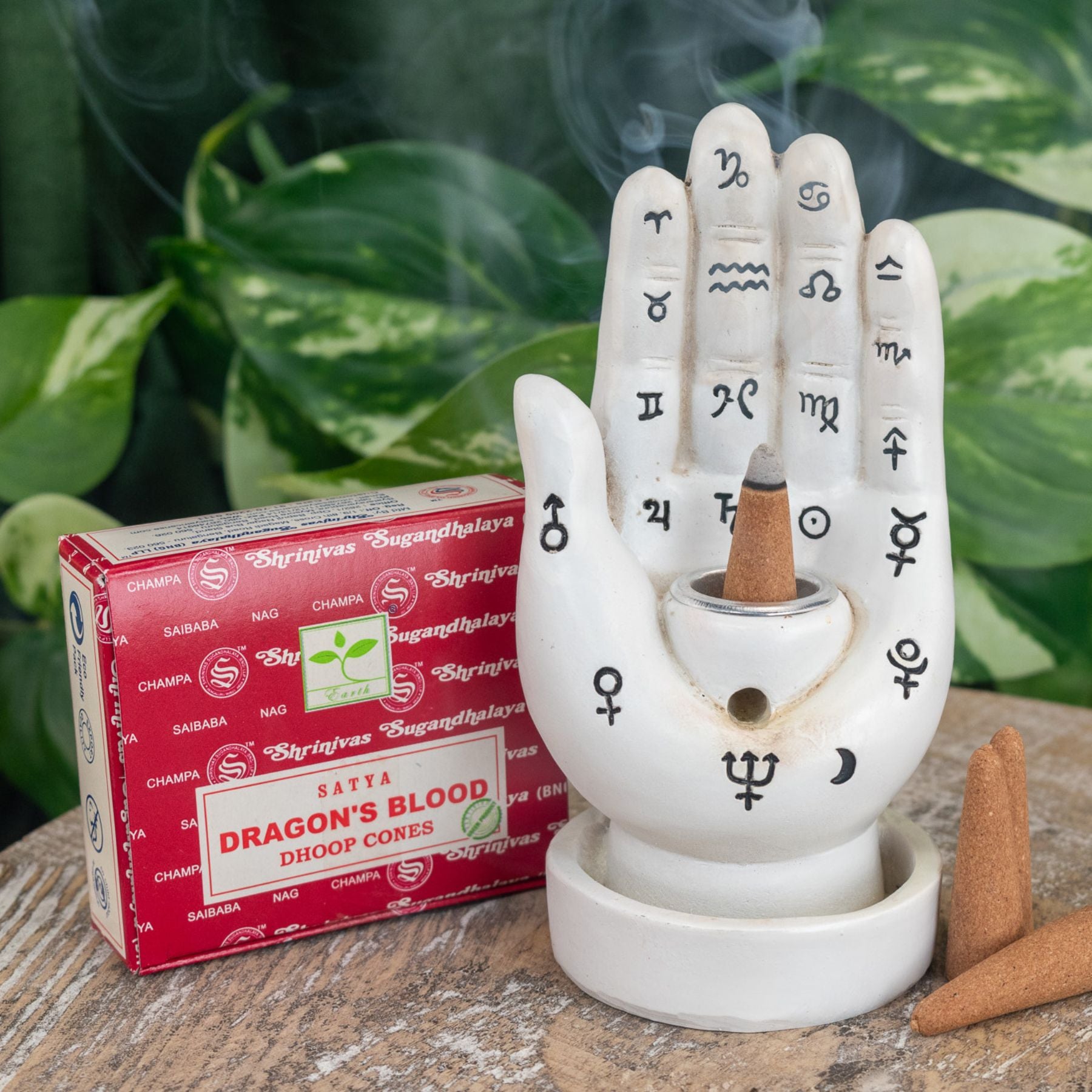 Each box contains 12 Satya dhoop incense cones and a small ceramic plate to burn them on.