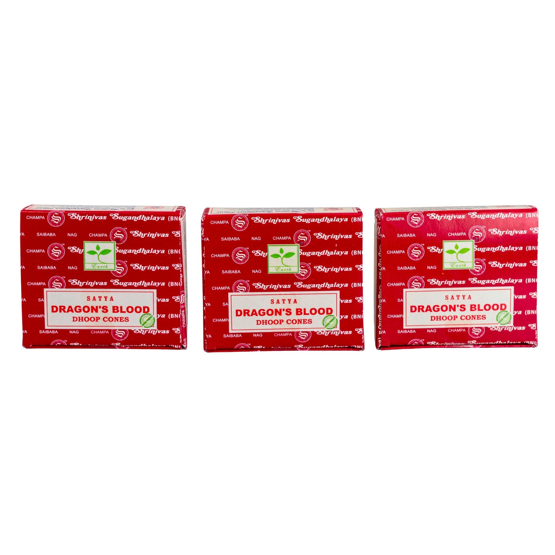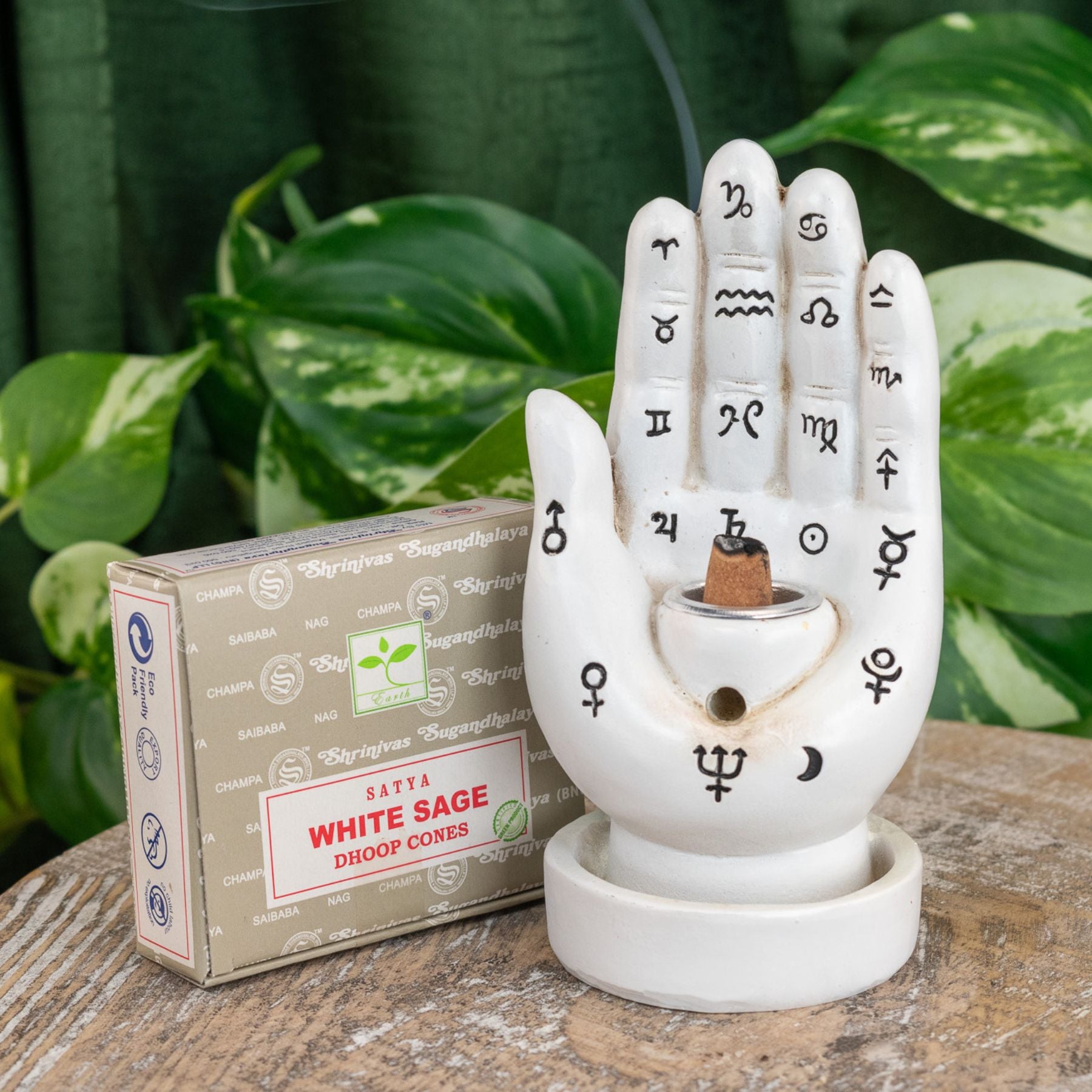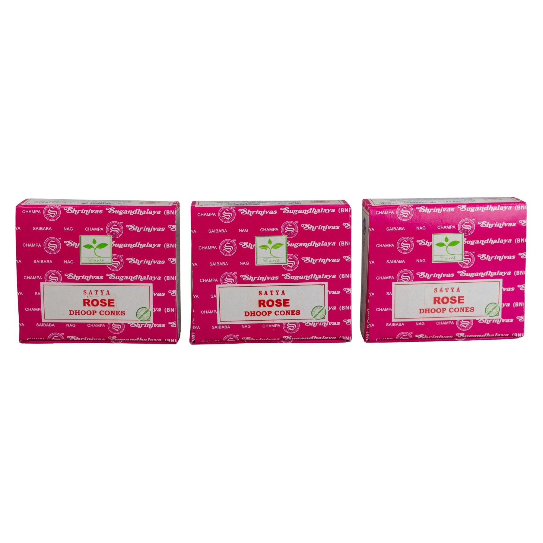 Each box contains 12 Satya dhoop incense cones and a small ceramic plate to burn them on.