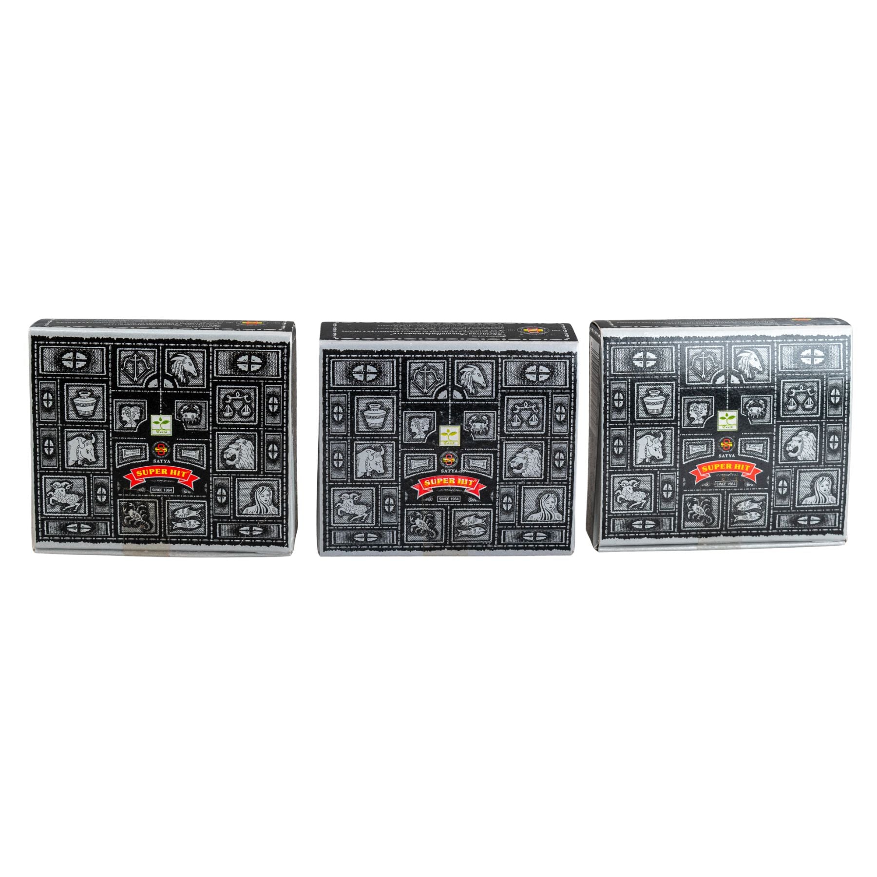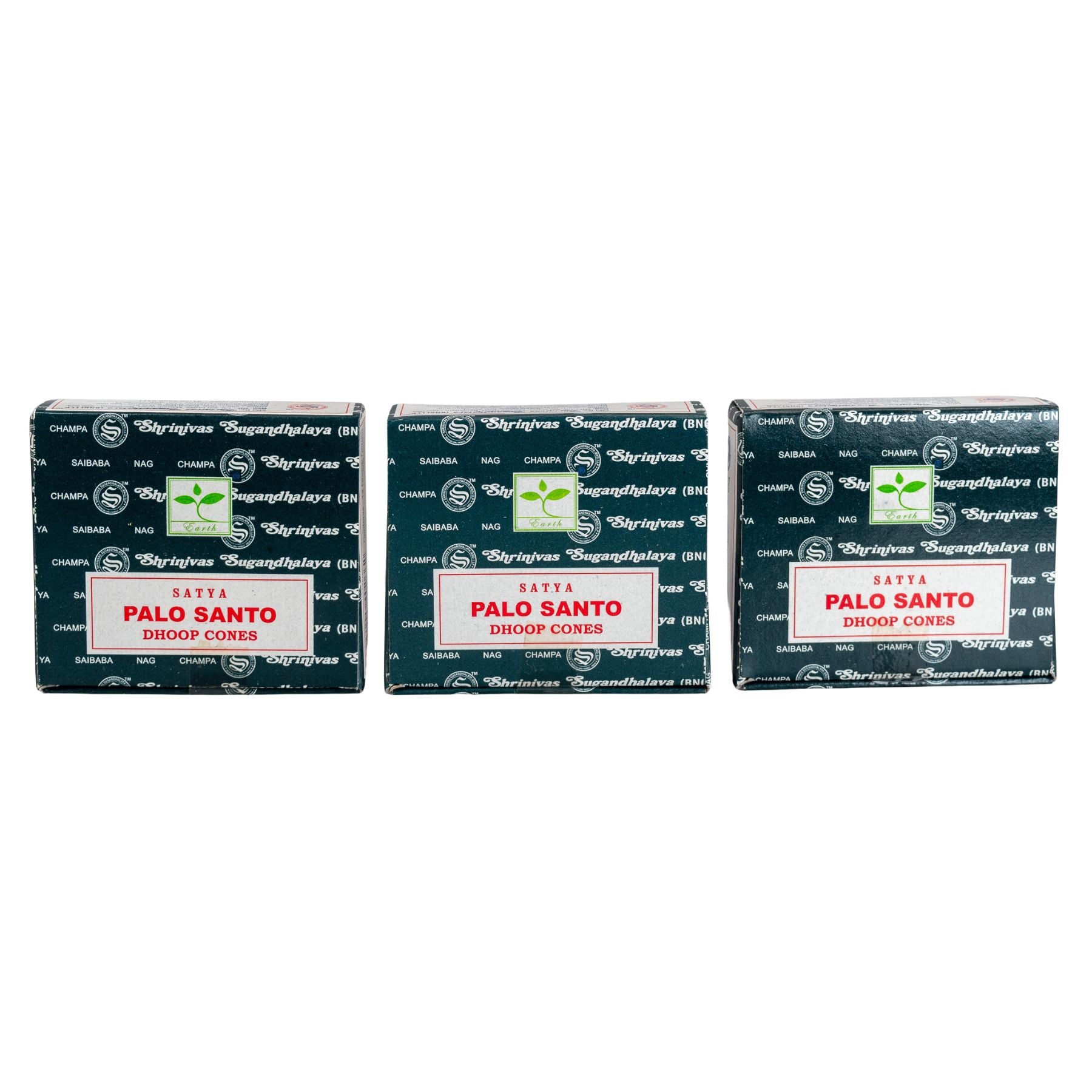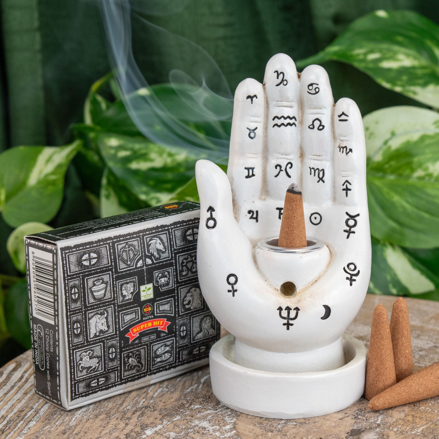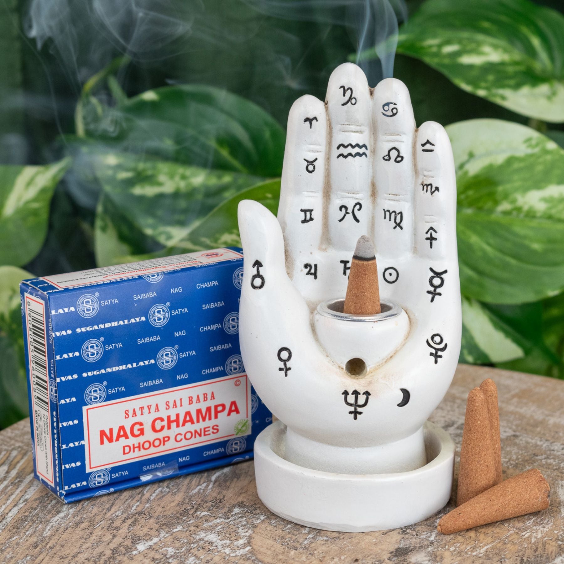 Each box contains 12 Satya dhoop incense cones and a small ceramic plate to burn them on.