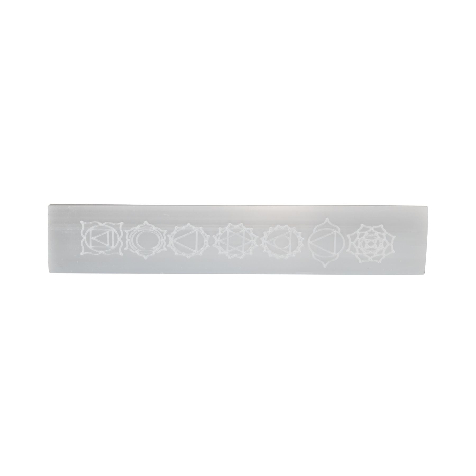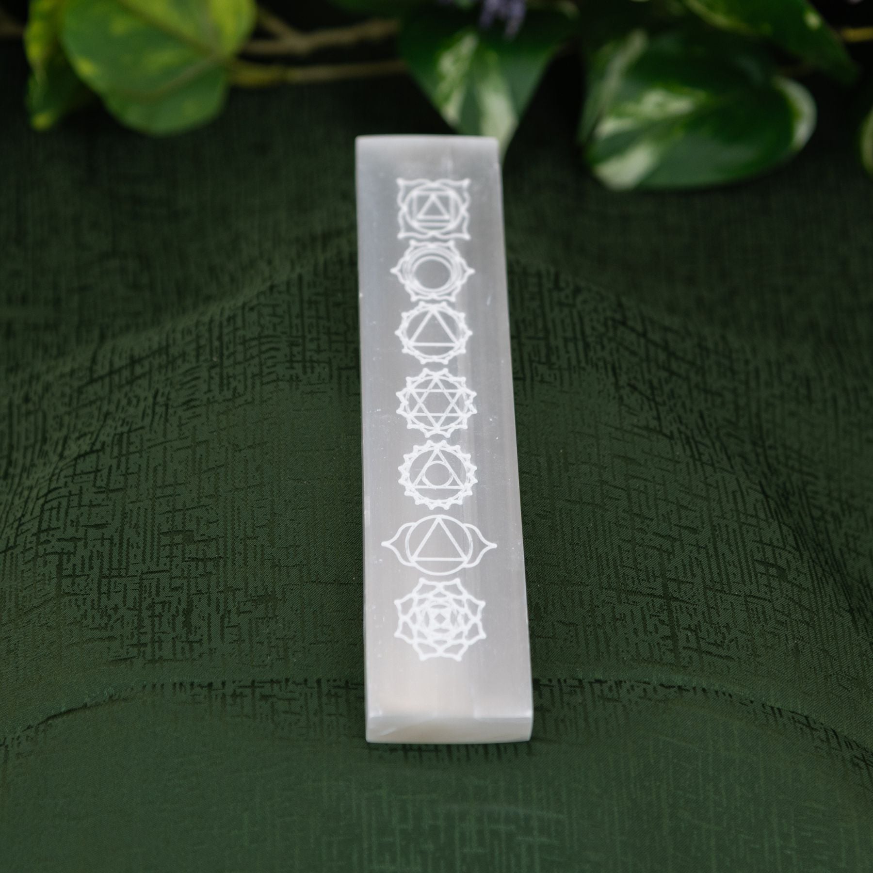 This unique 8" selenite wand is hand etched with the sacred geometry symbols representing the 7 chakras. Selenite is an extremely high vibrational crystal. It connects our conscious mind with our subconscious, bridging the gap between the two creating awareness and a newfound understanding of what has been occurring. What once confused us becomes clear and we begin to see the big picture. Its powerful vibration aligns us with the angelic realm and opens our Crown Chakra. Bestowing higher guidance upon us, Selenite soothes and purifies our tangled emotions allowing us to feel deep peace. Selenite has an ethereal quality believed to inhabit the space between light and matter. We can use Selenite to form a protective grid around our homes blocking out outside influences and instilling a safe and tranquil atmosphere inside. Selenite can also be used externally to help block negative influence from our mind, body and spirit.