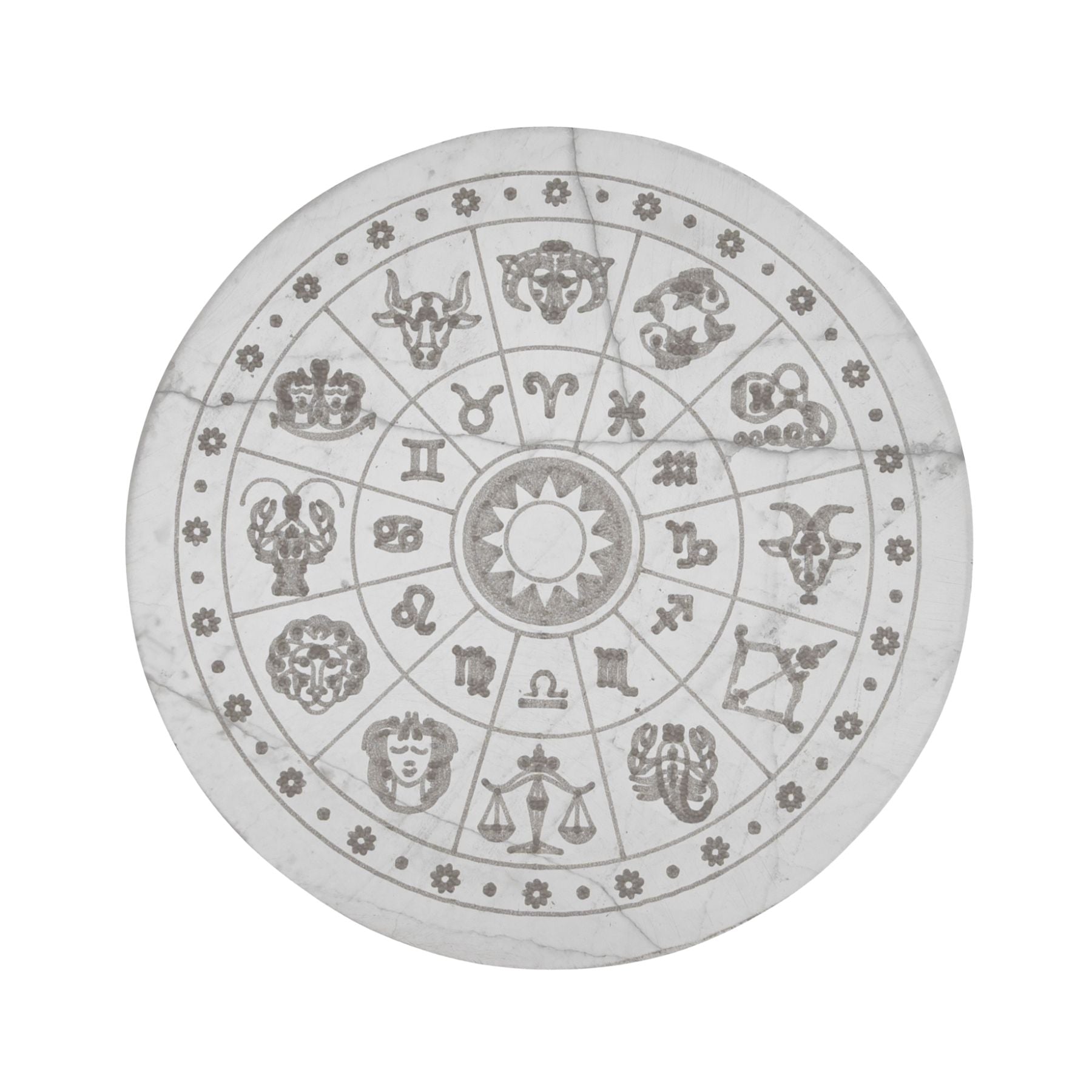 This unique 6" diameter selenite charging plate is hand etched with the astrological map. Selenite is an extremely high vibrational crystal. It connects our conscious mind with our subconscious, bridging the gap between the two creating awareness and a newfound understanding of what has been occurring. What once confused us becomes clear and we begin to see the big picture. Its powerful vibration aligns us with the angelic realm and opens our Crown Chakra. Bestowing higher guidance upon us, Selenite soothes and purifies our tangled emotions allowing us to feel deep peace. Selenite has an ethereal quality believed to inhabit the space between light and matter. We can use Selenite to form a protective grid around our homes blocking out outside influences and instilling a safe and tranquil atmosphere inside. Selenite can also be used externally to help block negative influence from our mind, body and spirit.