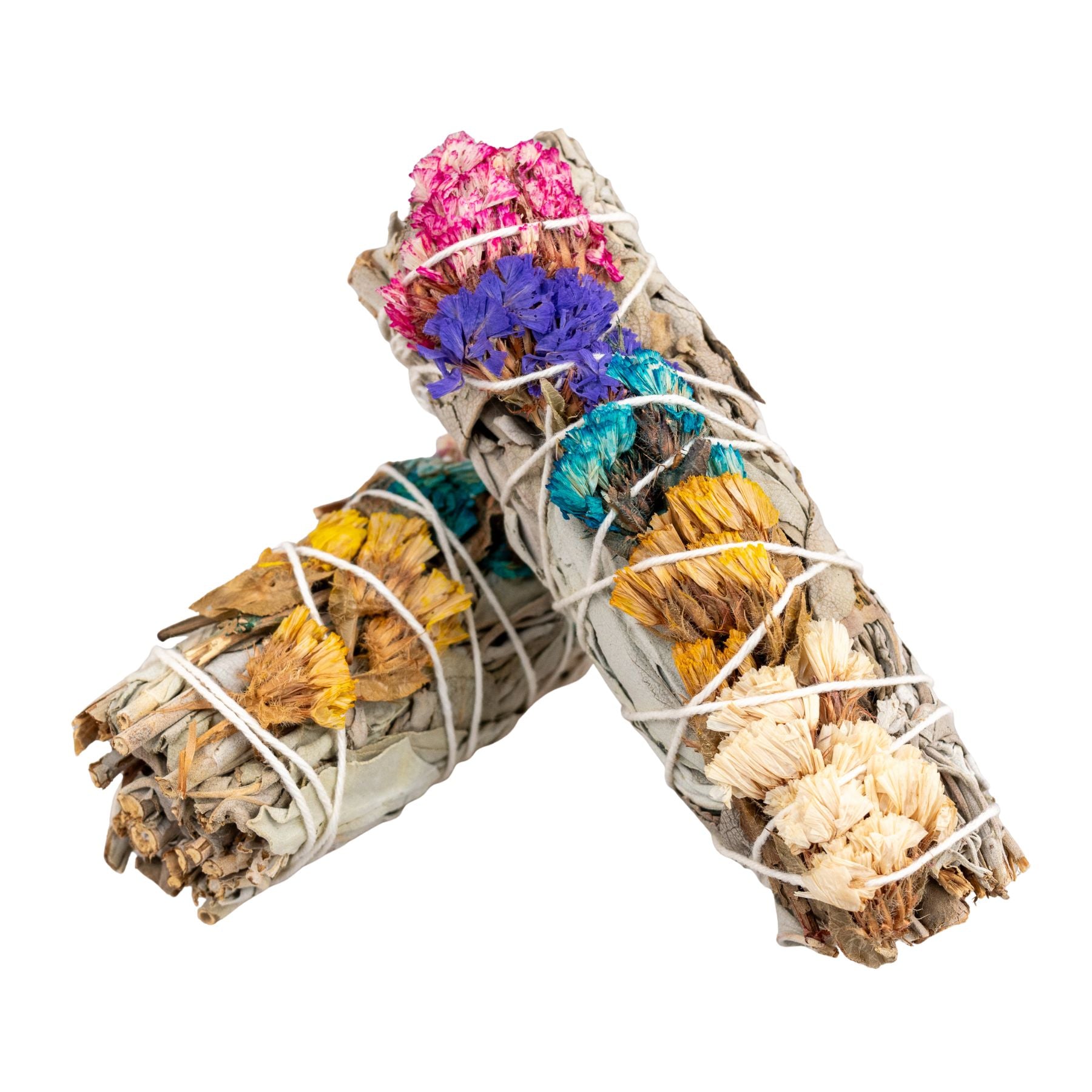 Elevate your spiritual practice with our 4 inch White Sage Smudge Stick decorated with a random assortment of colorful flowers. Each handcrafted bundle pairs the cleansing power of California White Sage with the beauty and symbolism of dried flowers, creating a unique smudge stick that’s as stunning as it is powerful.