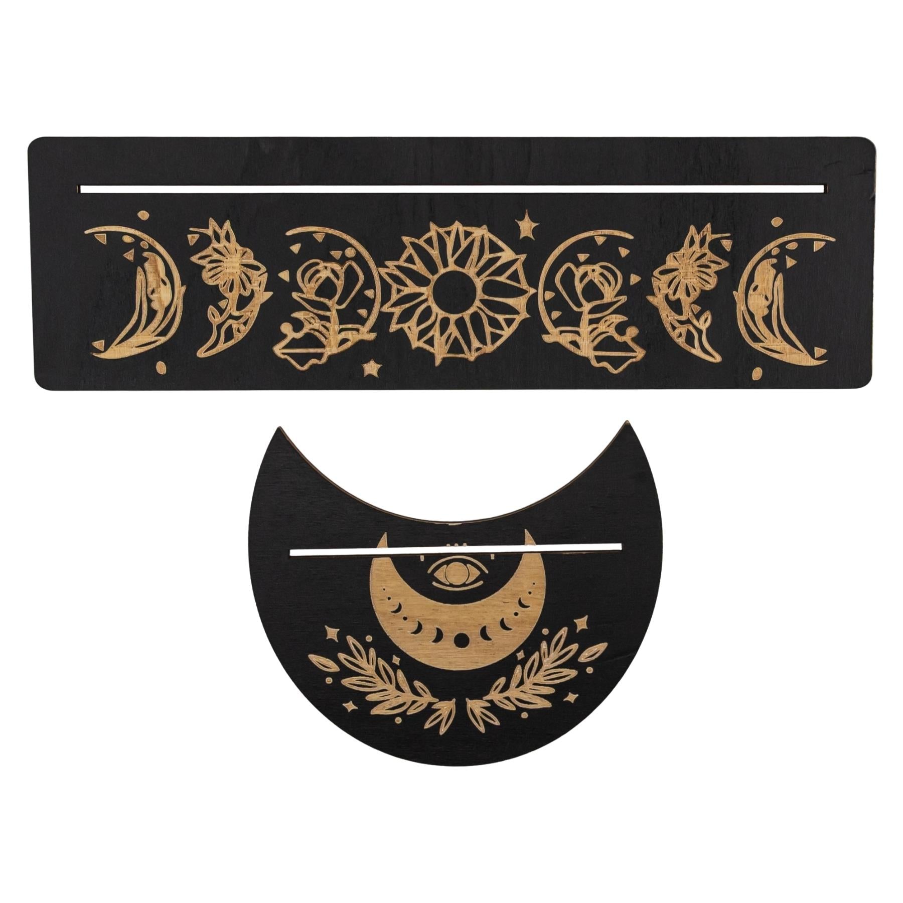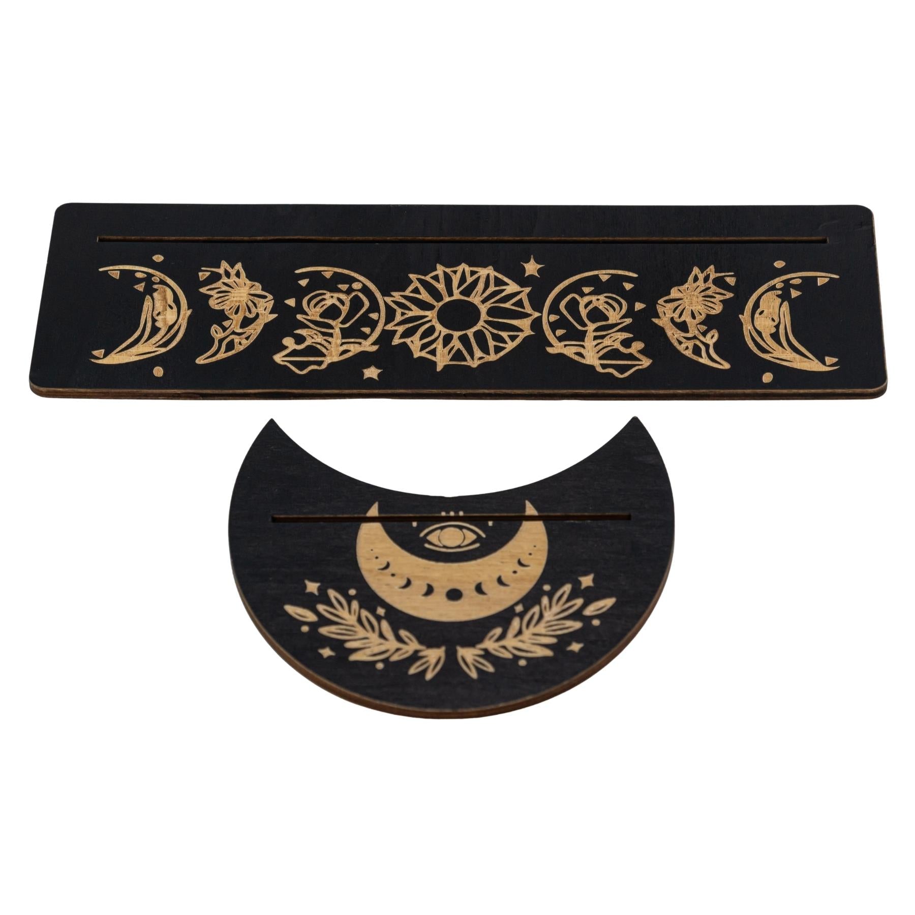 The Wooden Tarot Card Display set includes a 10-inch rectangular base and a 5-inch moon-shaped base, designed to showcase tarot or oracle cards during readings and meditation. Crafted from laser-cut wood with a sleek black finish, each stand is intricately engraved with moon phases, floral and celestial patterns, and protective symbols such as the evil eye. Precision-cut slots hold cards upright for hands-free viewing, making these stands both functional and decorative for altars, yoga studios, or sacred spaces.